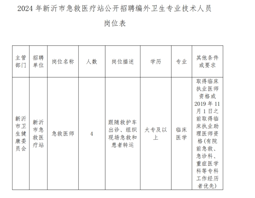 详见《2024年新沂市急救医疗站公开招聘编外卫生专业技术人员岗位表》。